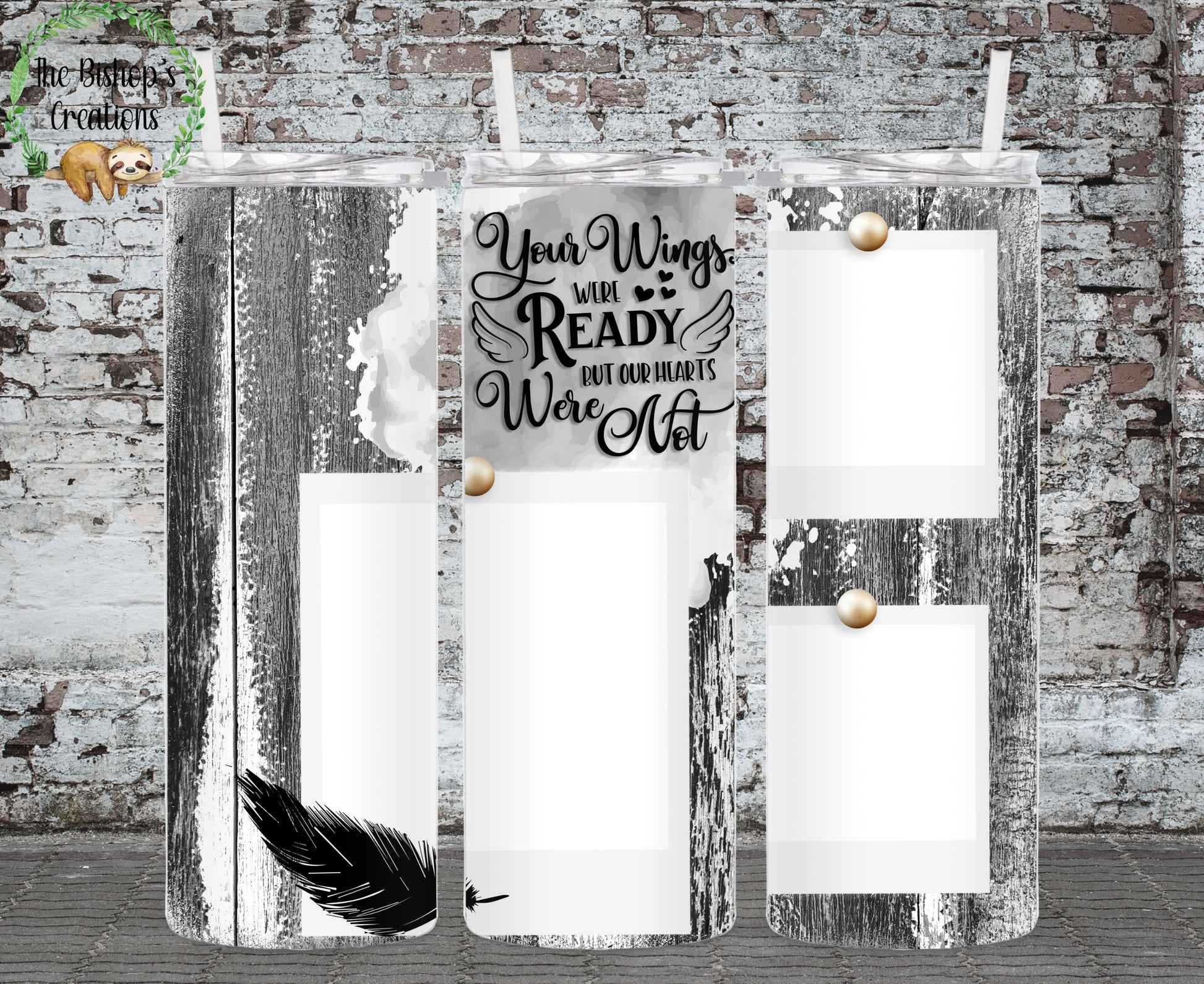 This Woodgrain Memorial Tumbler is made of stainless steel and offers superior thermal insulation, keeping drinks hot or cold for 8+ hours. It also comes with a straw, and offers the unique feature of 3 spots for photos to commemorate your special memories. Photos must be sent to thebishopscreations@gmail.com within 24 hours of ordering, with the order number included in the subject header.
